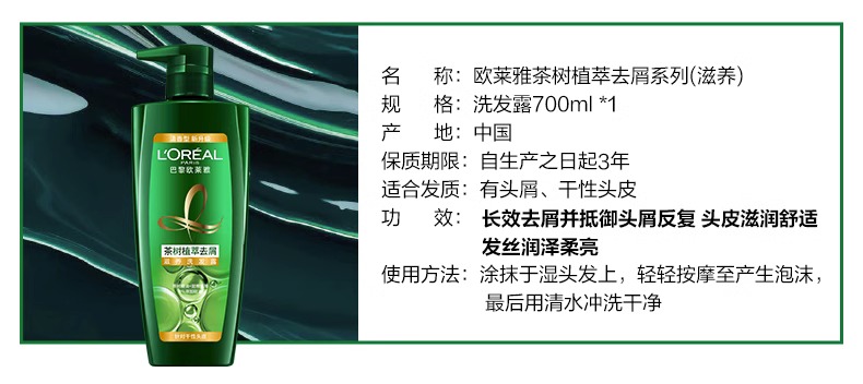 商品名称:巴黎欧莱雅茶树植萃去屑系列洗发露700ml